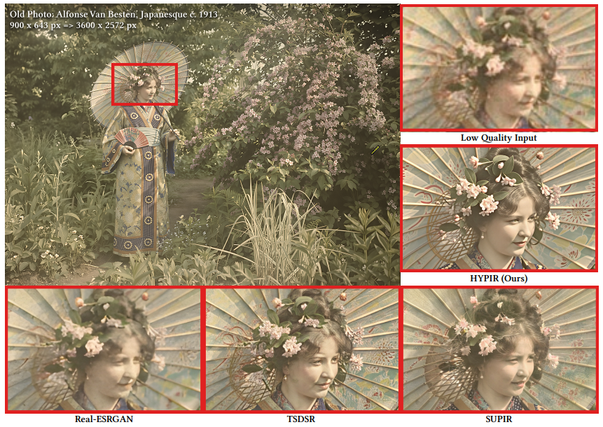 例如,在老照片修復方面,研究人員運用HYPIR修復了國內外經(jīng)典電影、電視劇老照片,讓模糊的影像重現(xiàn)清晰的細節(jié),為文化記憶傳承提供了技術支持。在高分辨率圖像修復領域,HYPIR同樣表現(xiàn)出色,因其兼具速度與效果,HYPIR成功攻克了傳統(tǒng)方法在生成8k分辨率圖像時往往面臨速度慢或效果不佳的難題。
