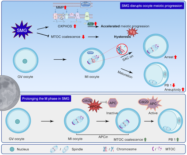 該研究顯示SMG誘導(dǎo)小鼠卵母細(xì)胞獨(dú)特的能量代謝損傷,表現(xiàn)為增加的氧化磷酸化(OXPHOS)與線粒體膜電位超極化,這不同于卵母細(xì)胞在常規(guī)重力下其他暴露所引起的能量代謝損傷,表明微重力與卵母細(xì)胞兩者的特殊性。與此同時(shí),SMG加速減數(shù)分裂進(jìn)程,但延遲了微管組裝中心(MTOC)融合,最終引起卵母細(xì)胞成熟阻滯。該研究針對加速的減數(shù)分裂進(jìn)程,使用了后期促進(jìn)復(fù)合體抑制劑(APCin)進(jìn)行分裂期延長。結(jié)果表明延長分裂期改善了紡錘體組裝與MTOC融合,最終恢復(fù)SMG下卵母細(xì)胞第一極體(PB1)排放情況。該研究為微重力下卵母細(xì)胞成熟與空間雌性生殖提供了理論依據(jù),并為未來開發(fā)空間生殖干預(yù)提供了潛在方案。