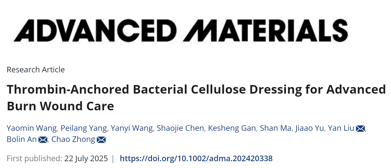 近日,中國科學(xué)院深圳先進技術(shù)研究院定量合成生物學(xué)全國重點實驗室、合成生物學(xué)研究所材料合成生物學(xué)研究中心鐘超團隊,聯(lián)合上海交通大學(xué)醫(yī)學(xué)院附屬瑞金醫(yī)院燒傷整形科劉琰團隊,在國際學(xué)術(shù)期刊Advanced Materials發(fā)表題為“Thrombin-Anchored Bacterial Cellulose Dressing for Advanced Burn Wound Care”的研究論文。該研究基于纖維素結(jié)合結(jié)構(gòu)域(CBD)的非共價橋連機制,成功將重組人源凝血酶固定于生物纖維素基體上,構(gòu)建出兼具止血與促愈合功能的一體化敷料(T-BC)。該材料在燒傷創(chuàng)面護理中表現(xiàn)出優(yōu)異的生物性能和組織修復(fù)能力,為嚴(yán)重創(chuàng)傷管理提供了新的材料策略,并展現(xiàn)出良好的臨床轉(zhuǎn)化潛力。