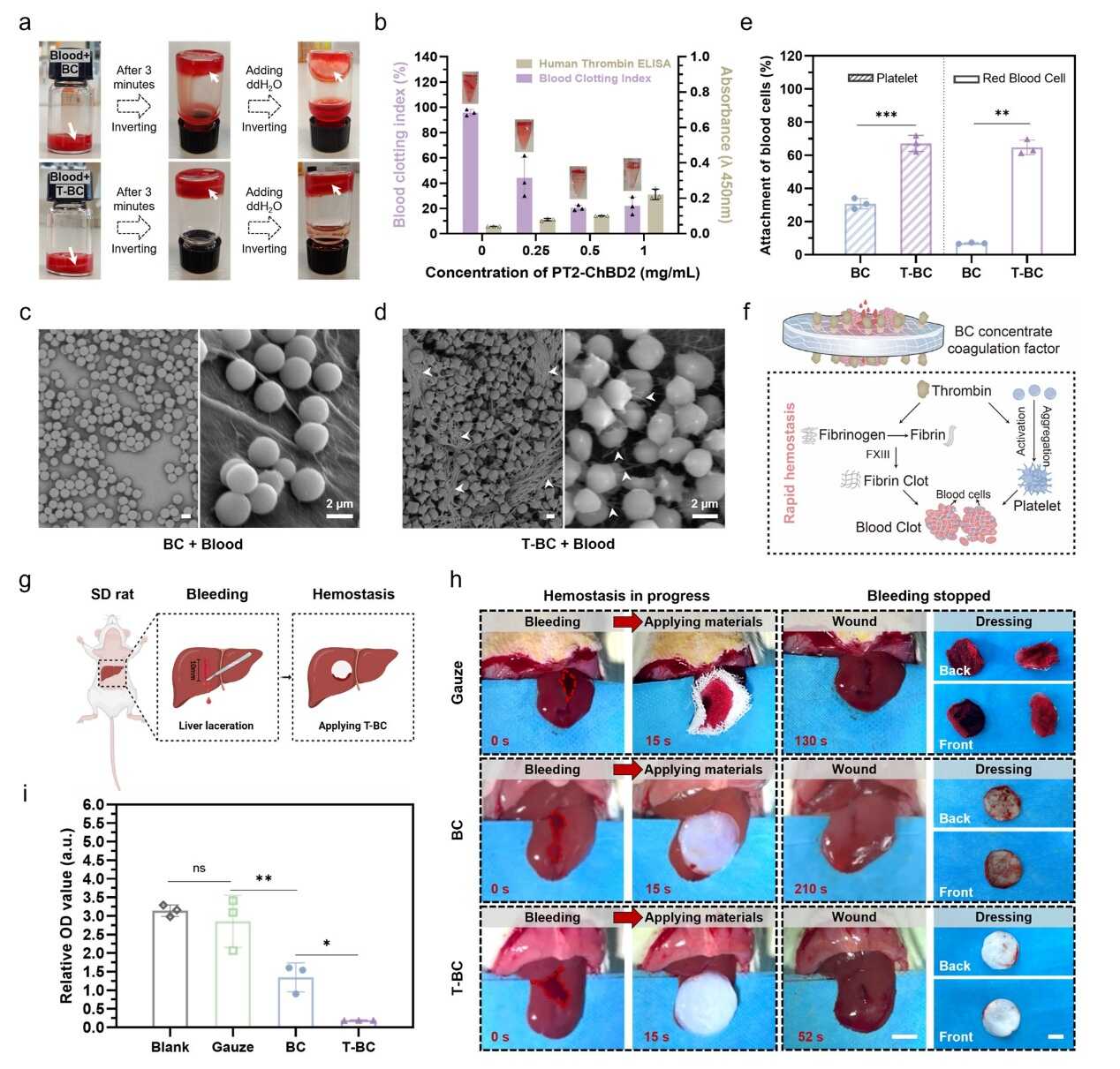 在初步實驗中,研究團隊首先篩選獲得了能夠與生物纖維素高效、穩(wěn)定結(jié)合的纖維素結(jié)合結(jié)構(gòu)域(CBD),并將其與人凝血酶原-2構(gòu)建為融合蛋白進行表達。該融合蛋白經(jīng)蛇毒酶Ecarin激活后成功轉(zhuǎn)化為具有完整酶活性的CBD-凝血酶,并在體外實驗中表現(xiàn)出顯著的促凝血功能,能夠快速誘導(dǎo)血液凝固。進一步通過大鼠肝臟切口模型驗證了該策略的止血效果:CBD-凝血酶與BC基質(zhì)的穩(wěn)定結(jié)合將BC轉(zhuǎn)化為具有生物活性的功能性止血敷料,可在1分鐘內(nèi)實現(xiàn)快速止血(圖2),表現(xiàn)出優(yōu)越的即時止血能力。此外,研究系統(tǒng)開展了T-BC敷料的細胞毒性、溶血活性與組織相容性評價,相關(guān)結(jié)果表明該材料具有良好的生物安全性,支持其在臨床燒傷創(chuàng)面修復(fù)中的應(yīng)用。