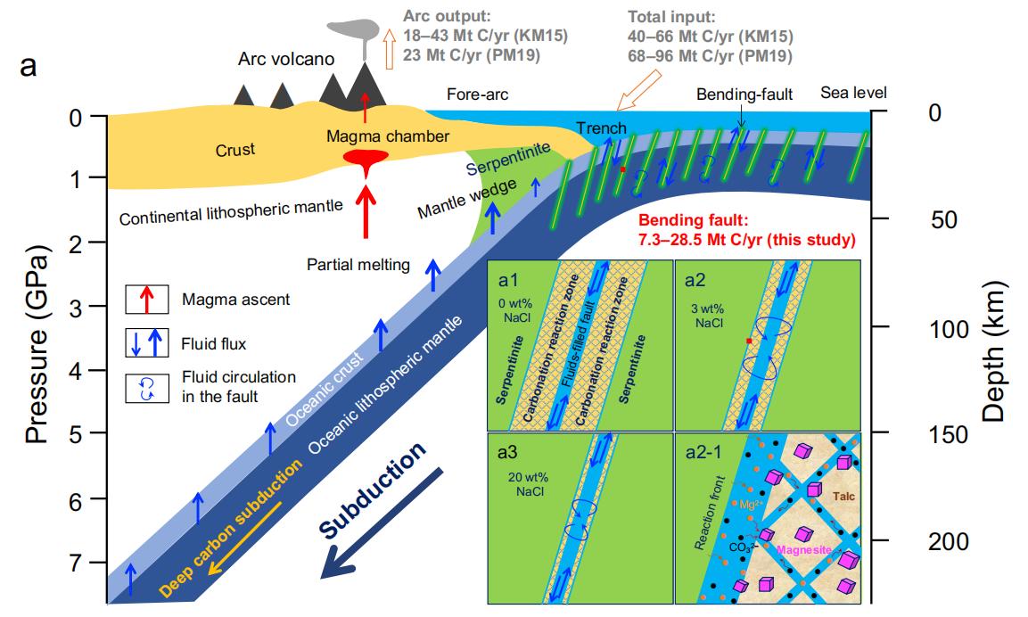 圖1. 俯沖板片彎曲斷層中的蛇紋石碳酸鹽化?(Huang et al.,2024 CMP)