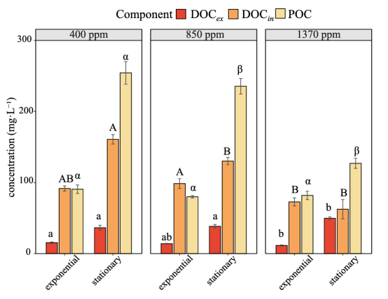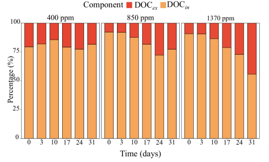 研究發(fā)現(xiàn),在中等CO2濃度(850 ppm)下,聚球藻的碳分配模式與當(dāng)前水平(400 ppm)相比未發(fā)生顯著變化。然而,在極端高CO2環(huán)境(1370 ppm)下,聚球藻的總有機(jī)碳含量顯著降低47.05%,同時細(xì)胞外溶解性有機(jī)碳(DOCex)的比例顯著上升,而POC和細(xì)胞內(nèi)DOC(DOCin)則顯著減少。DOCex在總DOC中的比例從22.66%上升至44.32%(圖1、2)。這一結(jié)果表明,極端高CO2環(huán)境下,聚球藻更傾向于將碳以潛在惰性DOC的形式釋放至水體中,而非用于構(gòu)建細(xì)胞結(jié)構(gòu)的DOCin和下沉性的POC。