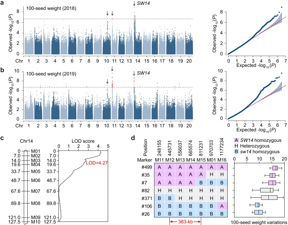 中國(guó)科學(xué)院華南植物園侯興亮團(tuán)隊(duì)研究通過全基因組關(guān)聯(lián)分析(GWAS)及QTL定位,在14號(hào)染色體上鑒定出一個(gè)與百粒重顯著相關(guān)的穩(wěn)定信號(hào)區(qū)間,并確定了一個(gè)調(diào)控大豆百粒重及品質(zhì)的關(guān)鍵基因SW14。進(jìn)一步研究發(fā)現(xiàn),SW14與植物種子發(fā)育核心調(diào)控因子Leafy Cotyledon1(LEC1)在大豆中的同源基因GmLEC1a/b發(fā)生互作,抑制了GmLEC1在種子發(fā)育過程中介導(dǎo)的轉(zhuǎn)錄激活功能。進(jìn)一步分析顯示,優(yōu)良等位基因SW14H3在大豆馴化過程中經(jīng)歷了人工選擇,并展現(xiàn)出提高大豆產(chǎn)量的應(yīng)用潛力。
