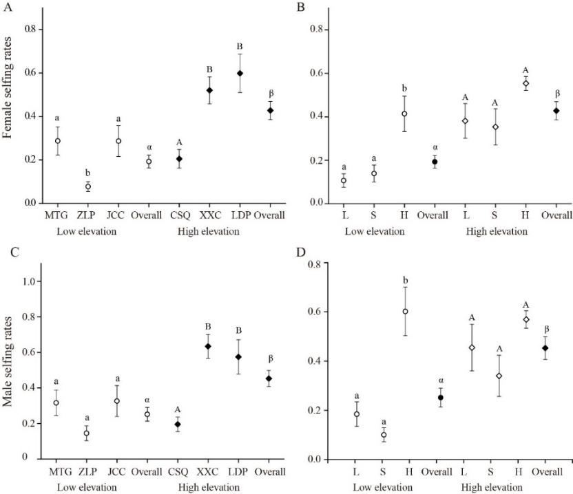 圖2.?低海拔與高海拔生境中不同種群和花型的母本自交率?(A,B)?與父本?(C,D)?自交率(±?標(biāo)準(zhǔn)誤)。不同小寫字母和大寫字母分別表示低海拔與高海拔生境內(nèi)的顯著差異,希臘字母表示生境間差異。