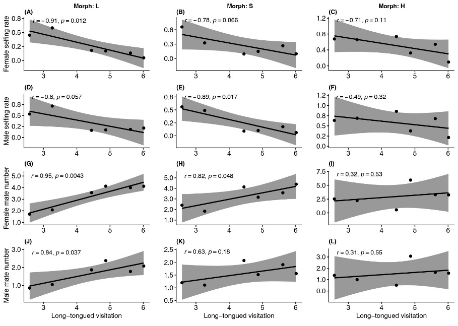 圖3.?交配系統(tǒng)參數(shù)與長(zhǎng)喙傳粉者訪花頻率在不同花型間的關(guān)系。母本自交率?(A–C)、父本自交率?(D–F)、母本配偶數(shù)?(G–I)?和父本配偶數(shù)?(J–L)。左、中、右三列分別對(duì)應(yīng)?L、S?和?H?三種花型。