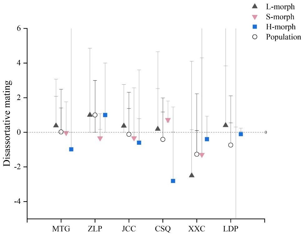 圖4.?不同種群和花型間雌性非選型交配(平均值?± 95%?置信區(qū)間)的變異。虛線表示隨機(jī)交配。