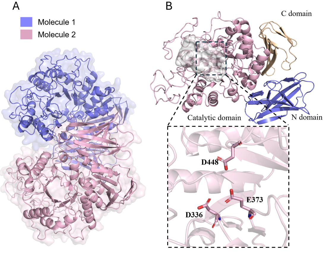 Apg屬于糖苷水解酶家族13_21 (GH13_21),通常負(fù)責(zé)水解α-1,4-O-糖苷鍵。但其獨(dú)特之處在于能有效水解結(jié)構(gòu)復(fù)雜的阿卡波糖。研究解析了Apg的高分辨率晶體結(jié)構(gòu)(圖3):(1)Apg在溶液中以同源二聚體形式存在,單體間通過(guò)N端結(jié)構(gòu)域和催化結(jié)構(gòu)域呈頭尾排列。(2)催化結(jié)構(gòu)域采用經(jīng)典的TIM桶折疊,活性位點(diǎn)是位于TIM桶頂部的一個(gè)突出表面凹槽,凹槽底部有一個(gè)絕對(duì)保守的催化三聯(lián)體(Asp-Glu-Asp)。(3)與其他淀粉酶(如MaIZ,MaIS)相比,Apg的活性口袋裂隙更窄(7.9 ?),能緊密結(jié)合阿卡波糖,計(jì)算也顯示其對(duì)阿卡波糖的結(jié)合親和力更高。(4)結(jié)合生化實(shí)驗(yàn)、晶體結(jié)構(gòu)和計(jì)算分析,發(fā)現(xiàn)兩個(gè)關(guān)鍵的柔性環(huán)(loop A和loop B)不僅影響底物結(jié)合還決定其催化能力。