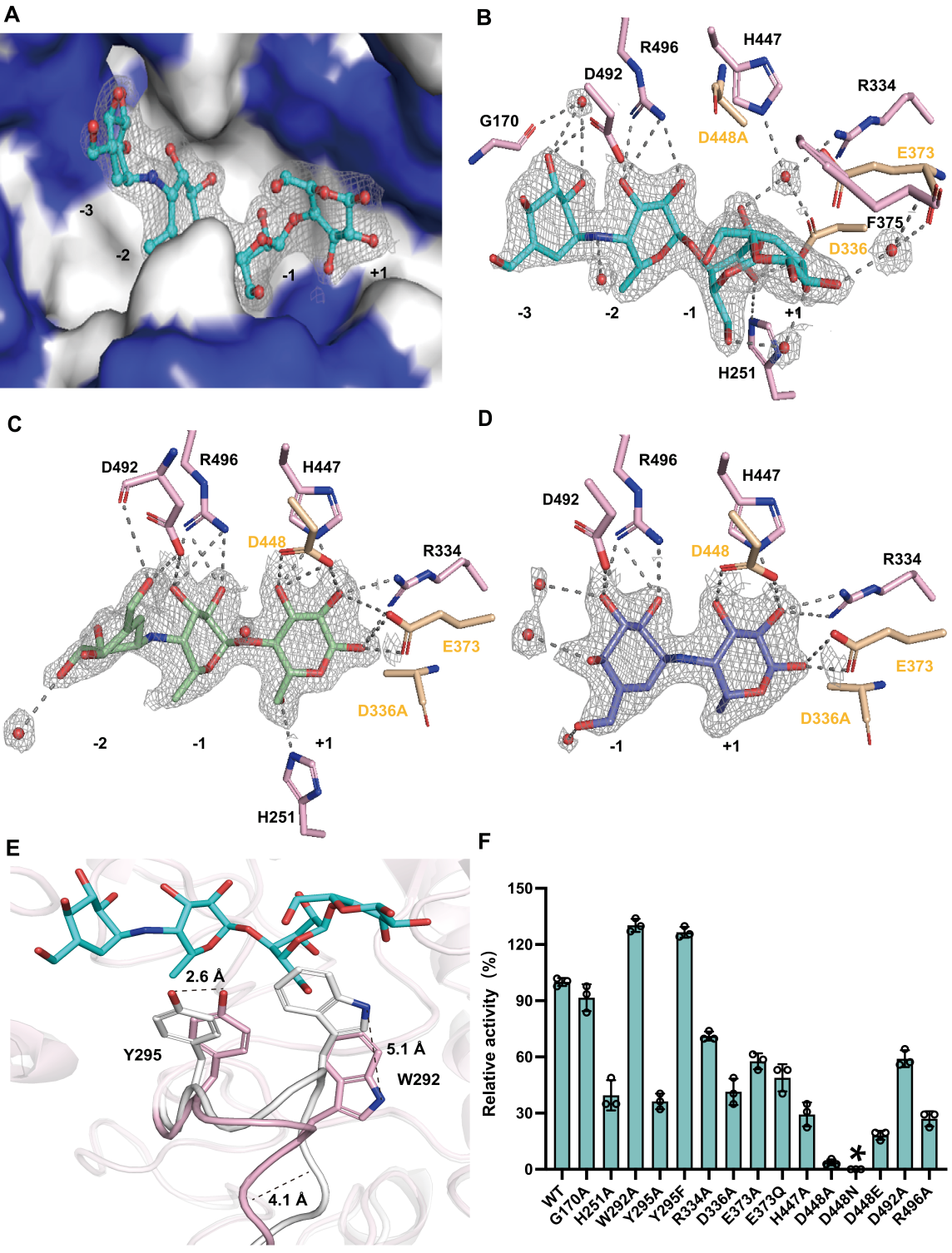 圖4 Apg?的復(fù)合物結(jié)構(gòu)及突變酶活分析。(A)Apg?活性位點(diǎn)腔內(nèi)底物阿卡波糖的示意圖。(B)Apg(D448A)-阿卡波糖的復(fù)合物結(jié)構(gòu)(PDB ID:9IVZ)。(C)Apg(D336A)-M1的復(fù)合物結(jié)構(gòu)(PDB ID:9IZE)。(D)Apg(D336A)-M2的復(fù)合物結(jié)構(gòu)(PDB ID:9IZO)。(E)Apg(D448A)-阿卡波糖復(fù)合物(PDB ID:9IVZ)(殘基為粉色)與突變體?Apg(D448A)(PDB?編號(hào):9IXH)的結(jié)構(gòu)疊加(殘基為白色)。(F)Apg?活性位點(diǎn)上殘基的誘變實(shí)驗(yàn)。