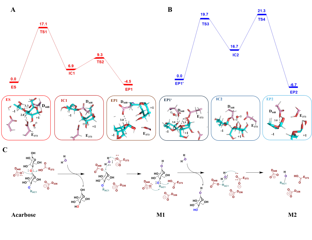 阿卡波糖被Apg水解的最終產(chǎn)物是二環(huán)的M2。關(guān)于M2是如何產(chǎn)生的,存在疑問(wèn):(1)是阿卡波糖直接一步水解成M2和麥芽糖?計(jì)算模擬(QM/MM)顯示此路徑能壘極高(36.9 kcal/mol),且實(shí)驗(yàn)中未檢測(cè)到麥芽糖副產(chǎn)物,排除了此可能性。(2)還是分步水解?晶體實(shí)驗(yàn)觀察到將Apg與中間產(chǎn)物M1孵育可生成M2。結(jié)合動(dòng)力學(xué)和熱力學(xué)分析發(fā)現(xiàn),Apg對(duì)阿卡波糖的親和力遠(yuǎn)高于對(duì)M1。進(jìn)一步的自由能計(jì)算發(fā)現(xiàn),Apg-阿卡波糖復(fù)合物的結(jié)合自由能(-20.5 kcal/mol)顯著低于Apg-M1(-13.8 kcal/mol)。QM/MM計(jì)算顯示,從M1水解到M2的能壘(19.7 kcal/mol)高于從阿卡波糖水解到M1的能壘(17.1 kcal/mol)。因此,阿卡波糖被Apg水解是一個(gè)明確的兩步過(guò)程:第一步為阿卡波糖→M1+葡萄糖(相對(duì)較快),第二步為M1→M2+葡萄糖(此步是限速步驟,較慢)。