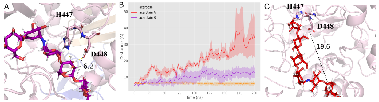 研究還利用解析的Apg結(jié)構(gòu),對(duì)已知對(duì)Apg具有抗性的阿卡波糖類似物——acarstatins A和acarstatins B進(jìn)行了計(jì)算分析。分子動(dòng)力學(xué)模擬顯示,它們也能結(jié)合在Apg活性腔內(nèi)。但關(guān)鍵差異在于,它們分子中水解位點(diǎn)C1原子與親核試劑D448 OD2的距離比阿卡波糖中的距離更遠(yuǎn),使得D448難以有效攻擊其糖苷鍵。進(jìn)一步的QM/MM計(jì)算證實(shí),水解acarstatinsA/B的活化能壘高于阿卡波糖。這為設(shè)計(jì)抗Apg降解的新藥提供了直接線索:通過(guò)修飾改變底物關(guān)鍵原子與催化殘基(特別是D448)的空間距離或相互作用。