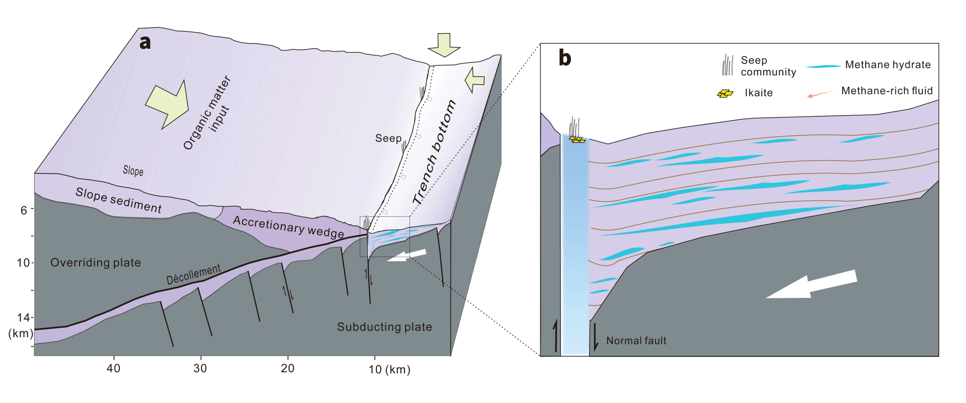 該研究對理解地球深部碳循環(huán)具有深遠意義。通過地球化學分析,研究人員發(fā)現這些環(huán)境中的甲烷實際上是由沉積層深處的微生物活動產生的。這一結果表明,在深淵海底之下還存在著一個前所未知的、龐大活躍的深部生物圏,不斷將由沉降有機質分解而來的二氧化碳轉化為甲烷。因此,這一過程可能封存了大量的從上層海洋沉降的有機碳,并以天然氣水合物等形式在深淵海底形成規(guī)模巨大的甲烷儲庫,挑戰(zhàn)了傳統的深海碳循環(huán)和碳收支模式。