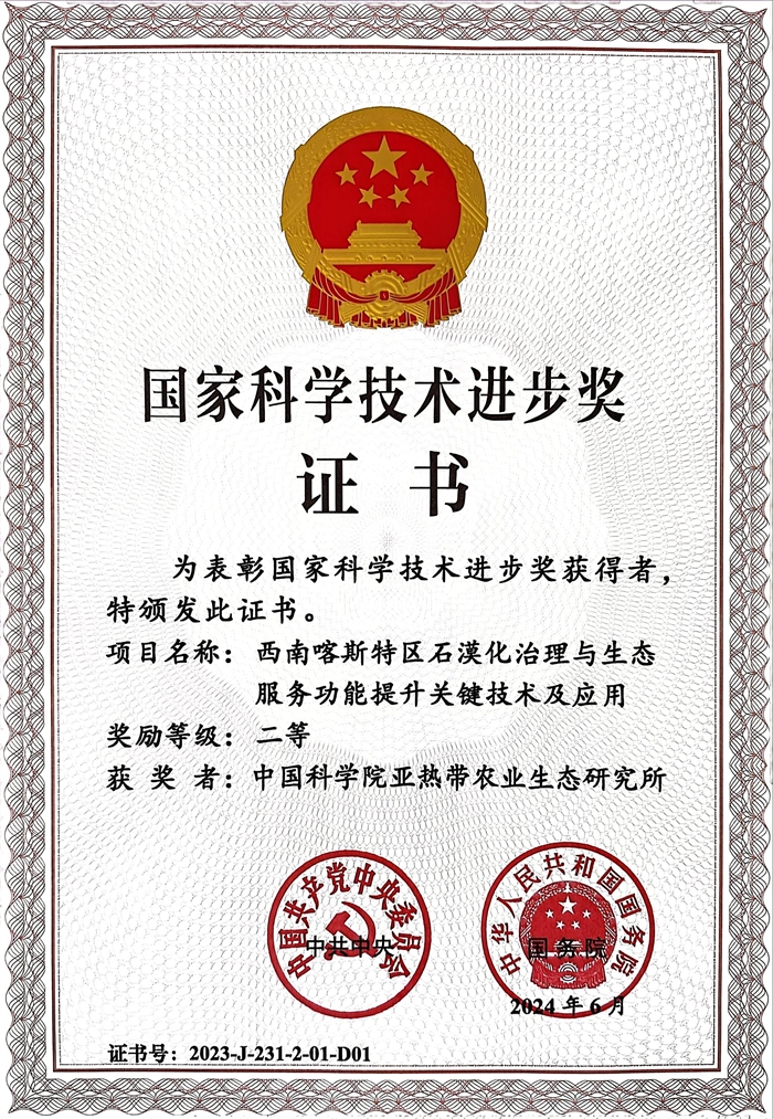 6月24日,2023年度國家科學(xué)技術(shù)獎勵大會在北京召開。中國科學(xué)院亞熱帶農(nóng)業(yè)生態(tài)研究所為第一完成單位的“西南喀斯特區(qū)石漠化治理與生態(tài)服務(wù)功能提升關(guān)鍵技術(shù)及應(yīng)用”成果榮獲國家科學(xué)技術(shù)進(jìn)步獎二等獎。