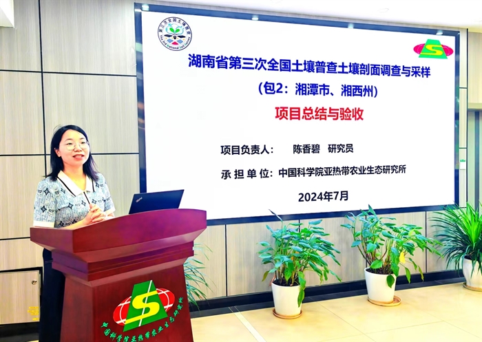 會(huì)上,項(xiàng)目負(fù)責(zé)人陳香碧研究員對(duì)項(xiàng)目來(lái)源與任務(wù)、任務(wù)完成情況、實(shí)施關(guān)鍵過(guò)程、問(wèn)題與整改情況、亮點(diǎn)工作、 市州三普土壤分類等情況進(jìn)行了匯報(bào)。該項(xiàng)目組建了一支40余人專業(yè)技術(shù)人員組成的外業(yè)工作組,于2023年9月至2024年3月,連續(xù)6個(gè)月開(kāi)展外業(yè)踏勘、調(diào)查和采樣工作,完成了湘潭市和湘西州476個(gè)剖面樣點(diǎn)調(diào)查與采樣,共采集發(fā)生層樣品1766個(gè)、容重樣1706個(gè)、水團(tuán)樣324個(gè)、整段標(biāo)本459個(gè)、紙盒樣479個(gè)。