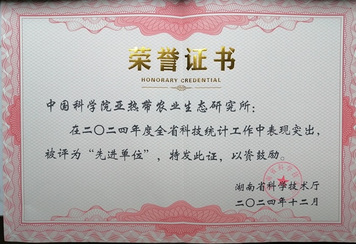 12月27日,湖南省科學(xué)技術(shù)廳召開(kāi)了2024年度全省科技統(tǒng)計(jì)工作會(huì)議暨第6期科技創(chuàng)新大講堂。會(huì)議總結(jié)了2024年科技統(tǒng)計(jì)工作與創(chuàng)新調(diào)查工作,表彰了全省科技統(tǒng)計(jì)工作成效突出的單位。中國(guó)科學(xué)院亞熱帶農(nóng)業(yè)生態(tài)研究所被評(píng)為“2024年度科技統(tǒng)計(jì)工作先進(jìn)單位”。